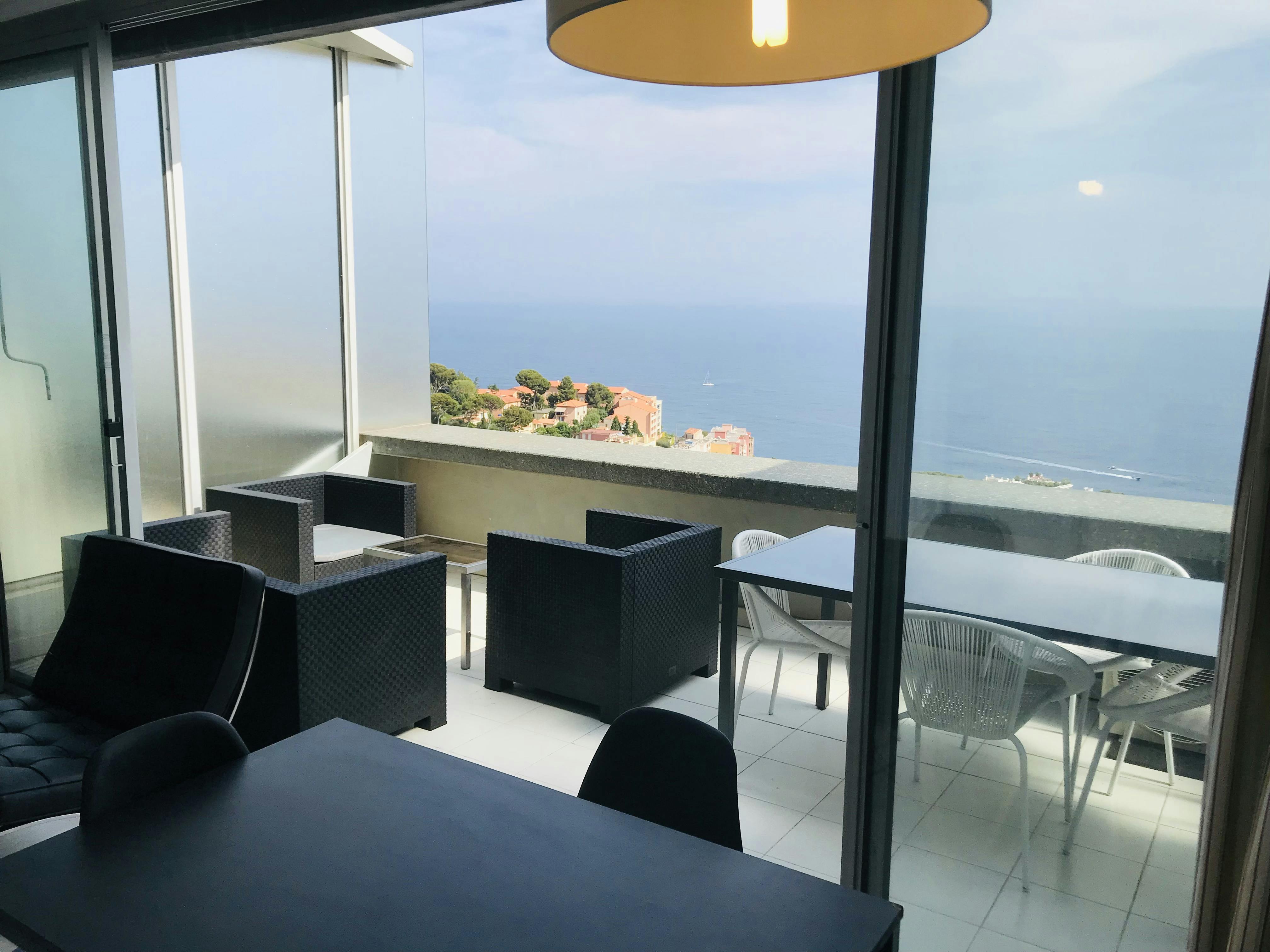 Grand studio rénové de 30 m2 au dernier étage au Cap d'Ail avec une superbe vue panoramique sur la mer et une piscine miroir à débordement. Il est composé